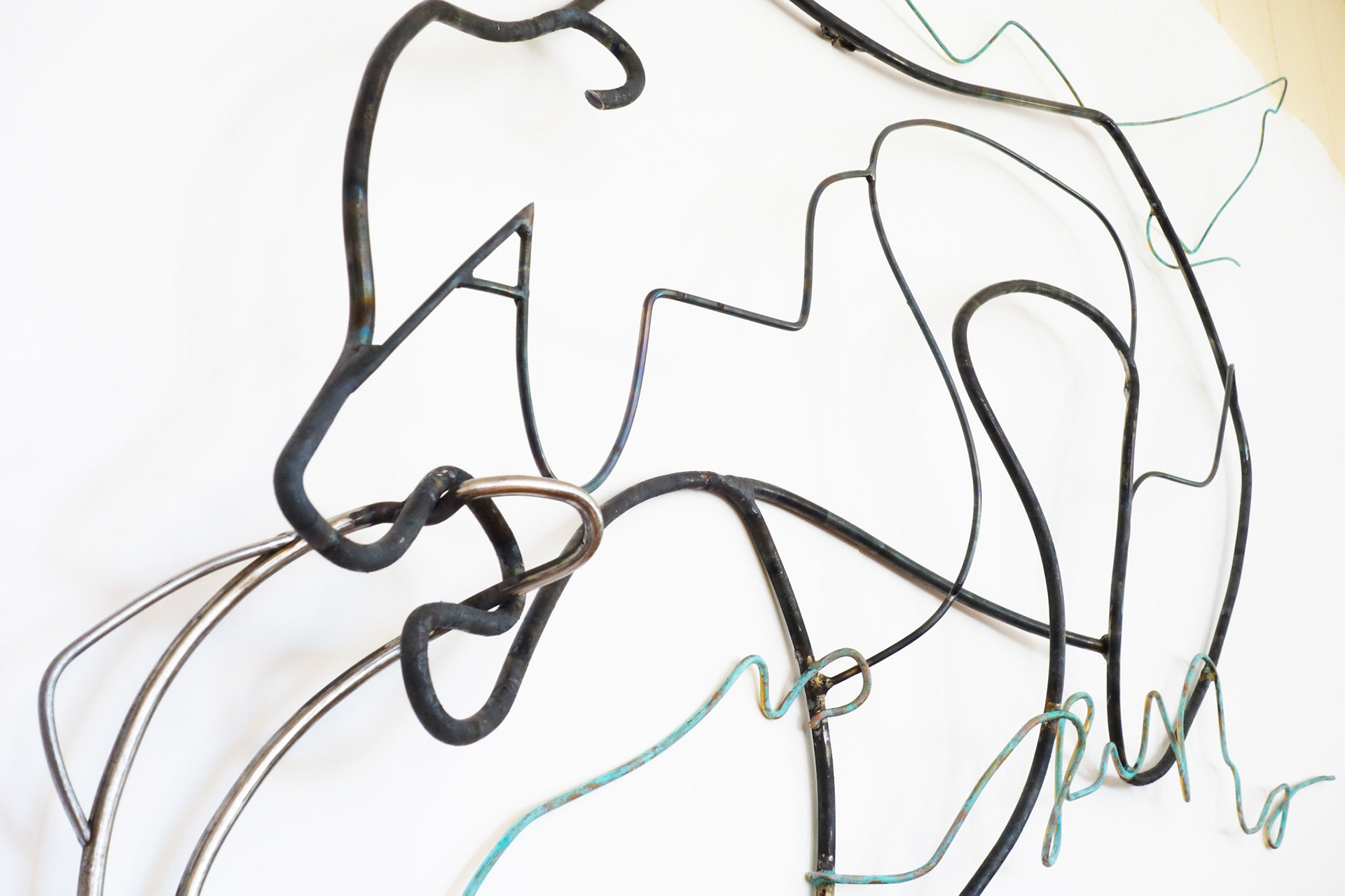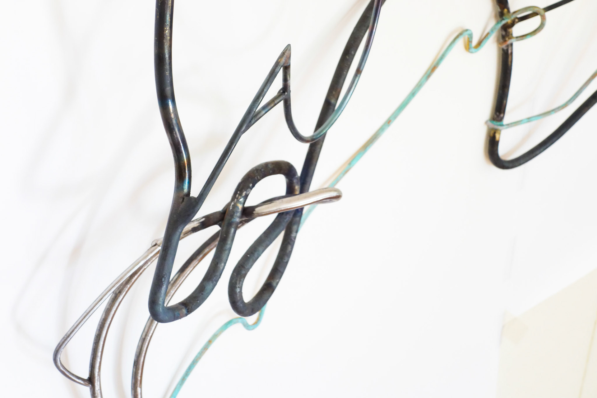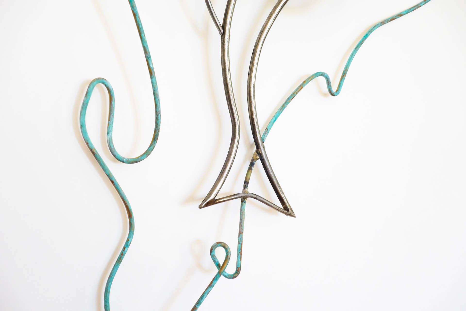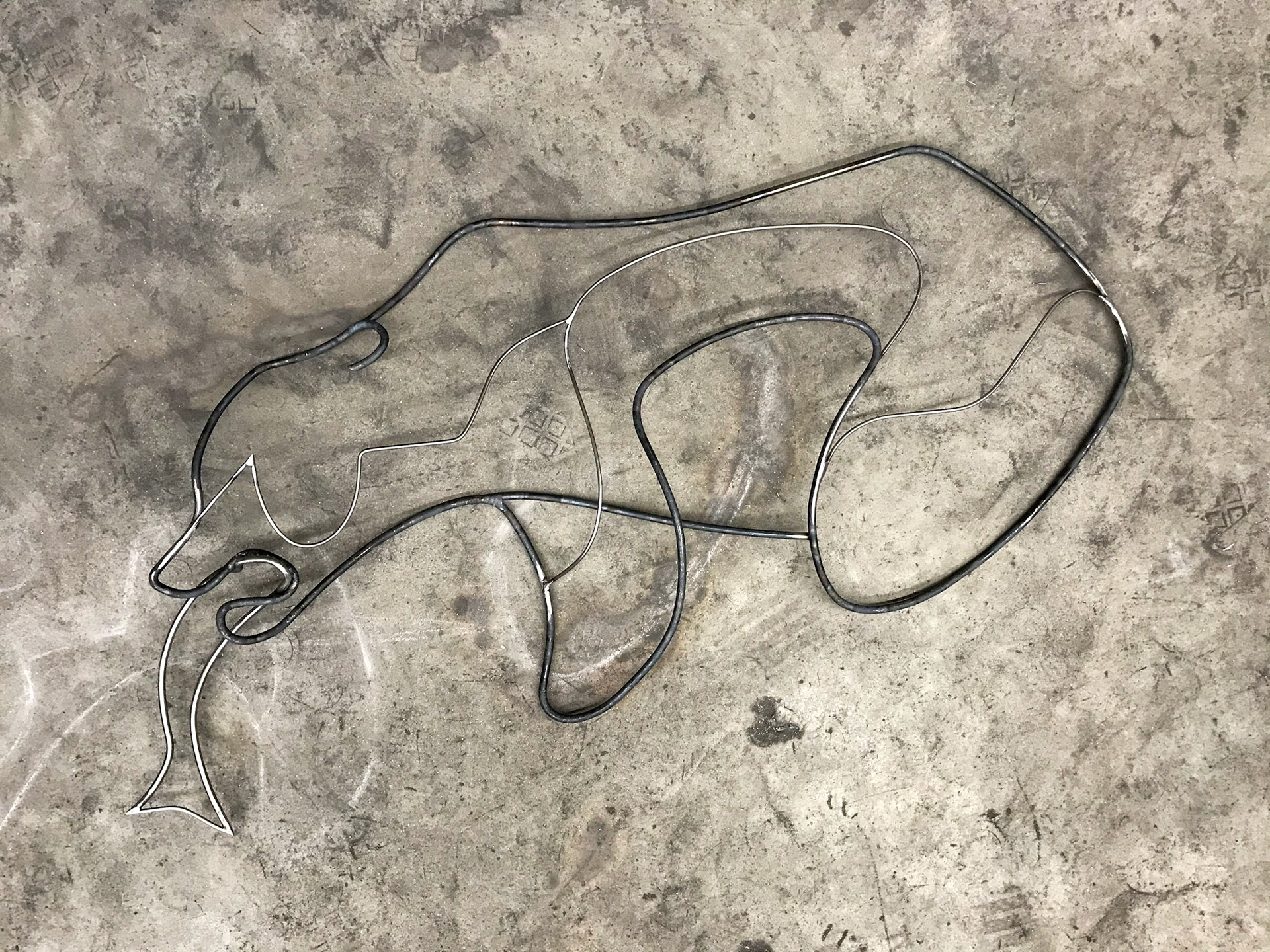 A grizzly, out for dinner at the riverside diner. Mild and stainless steels, plus brass, with a water-blue patina. Created for a private client with the aim to honor an essential keystone species.