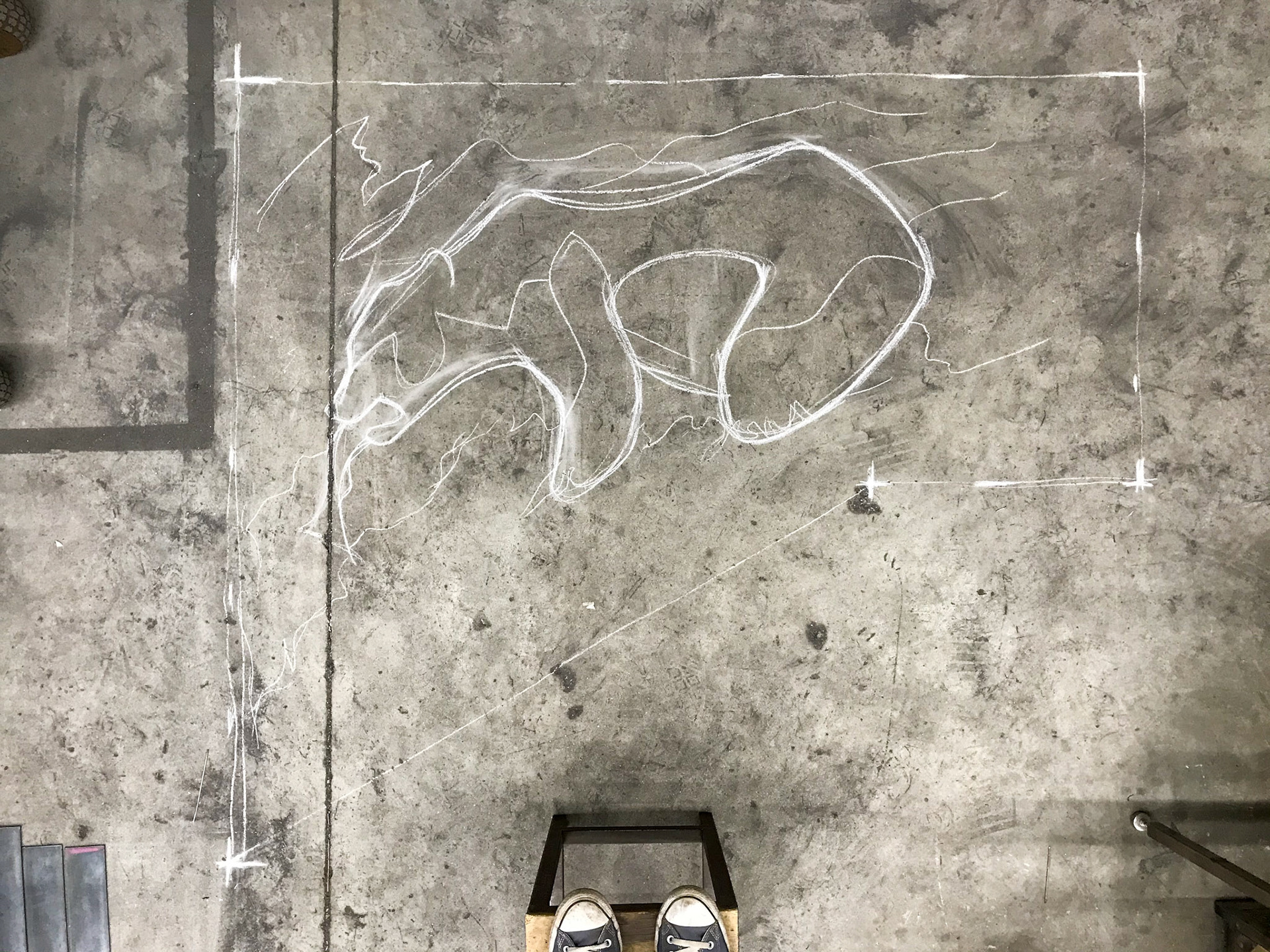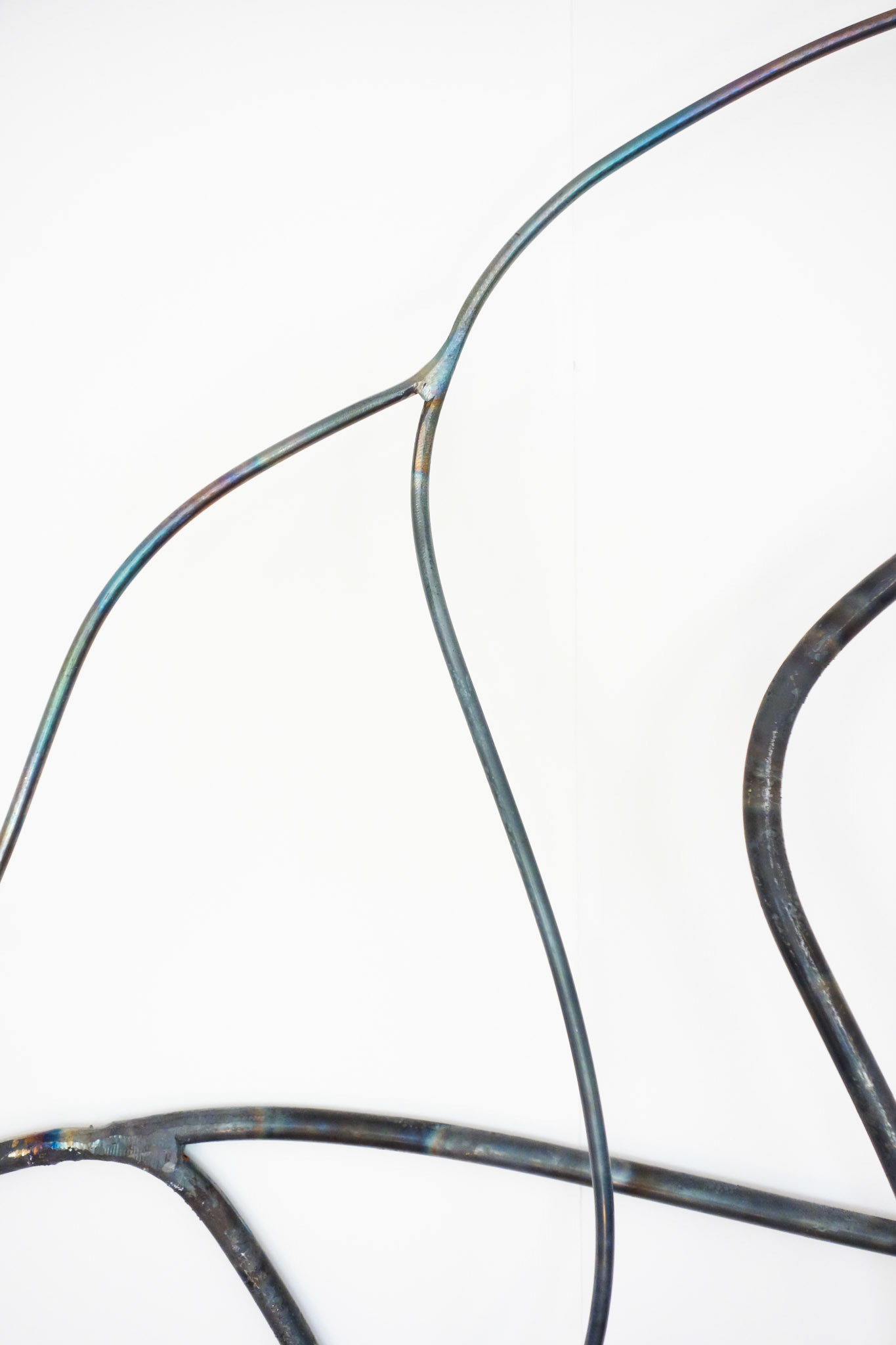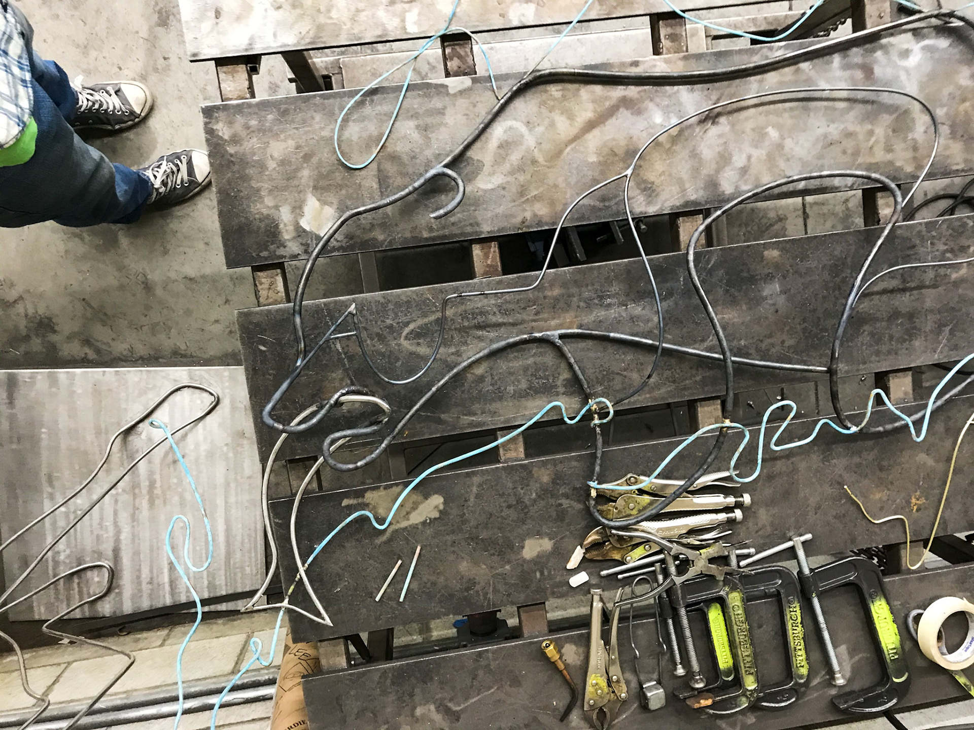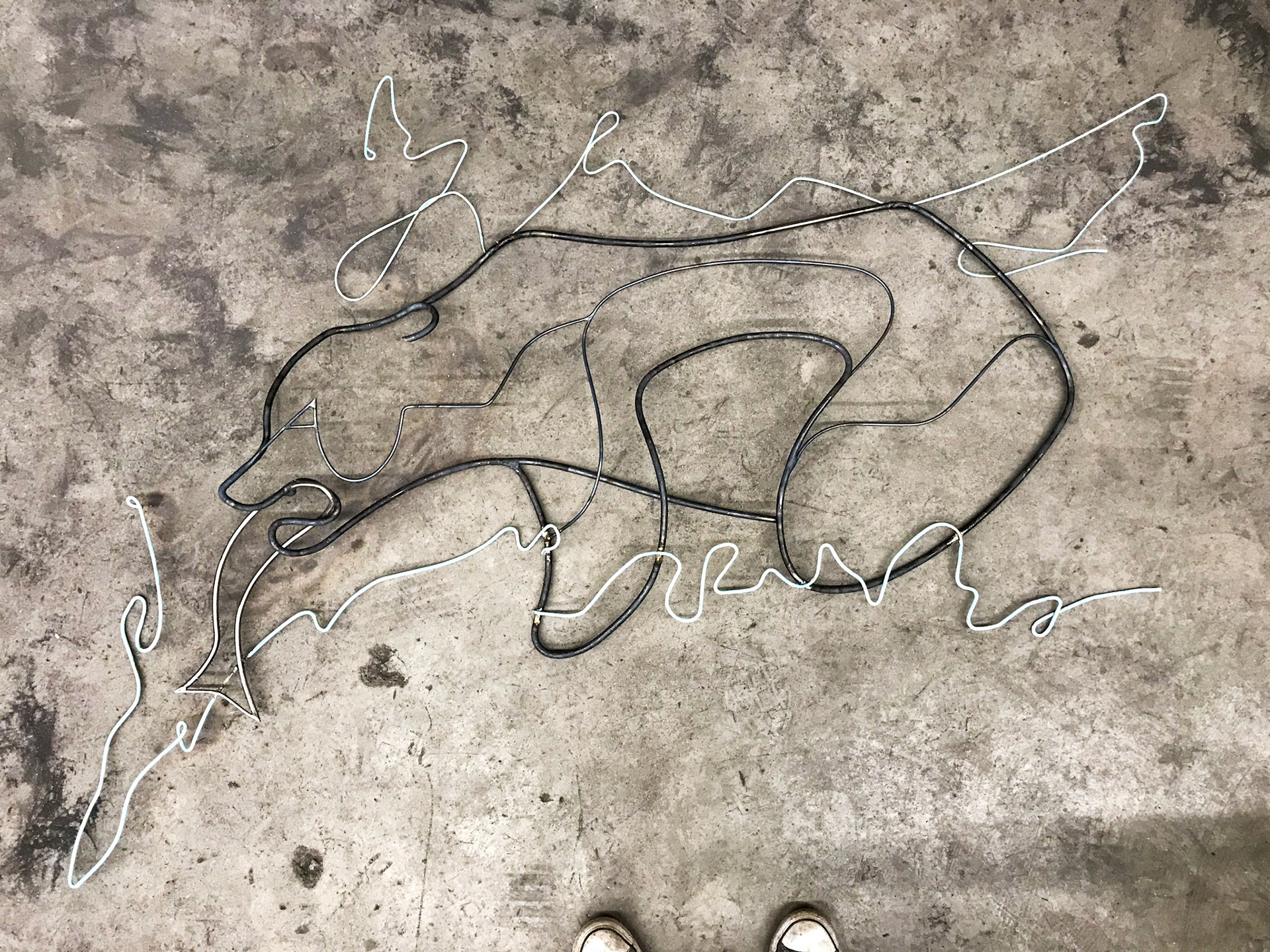 A grizzly, out for dinner at the riverside diner. Mild and stainless steels, plus brass, with a water-blue patina. Created for a private client with the aim to honor an essential keystone species.